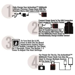 The ActionHeatâ„¢ battery heated vests are revolutionary in the world of heated clothing. Using the patented 5V signal technology, it allows for any 5V battery to be used with the ActionHeat Jackets and Vests. This allows for unlimited battery options and gives you more options! The ActionHeat Jacket comes with a super powerful ActionHeatâ„¢ 5V Power Bank 6000mAh. This powerbank powers your jacket and can also charge your phone, tablet, or any USB charged device. Note: Heating times will deminish if used to charge other devices.