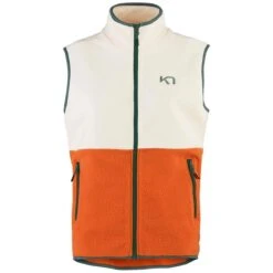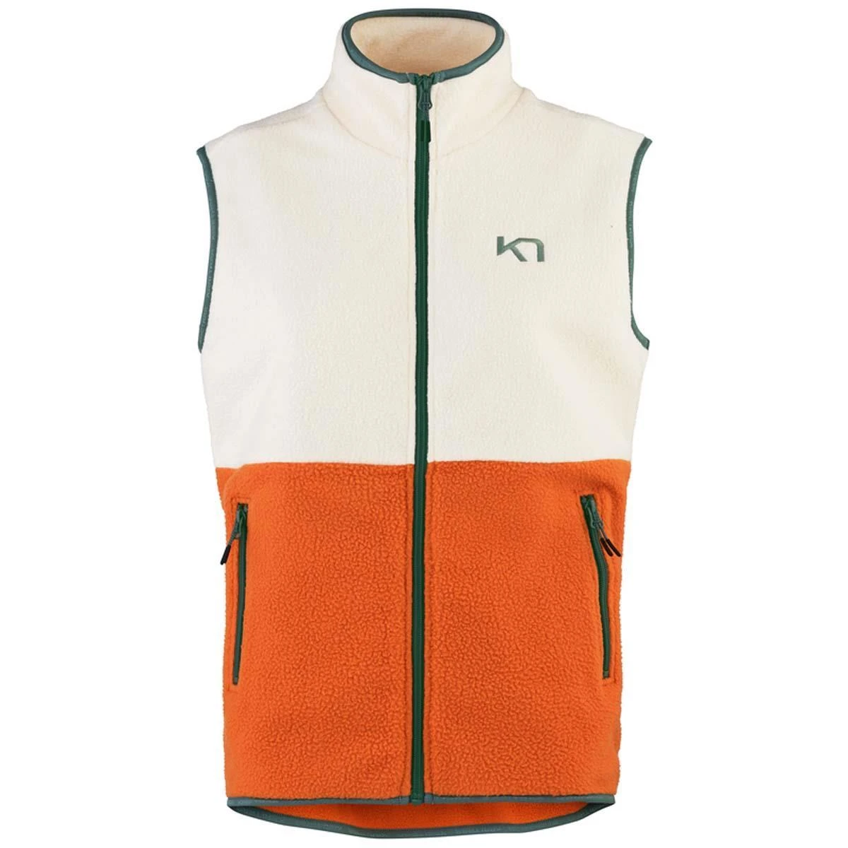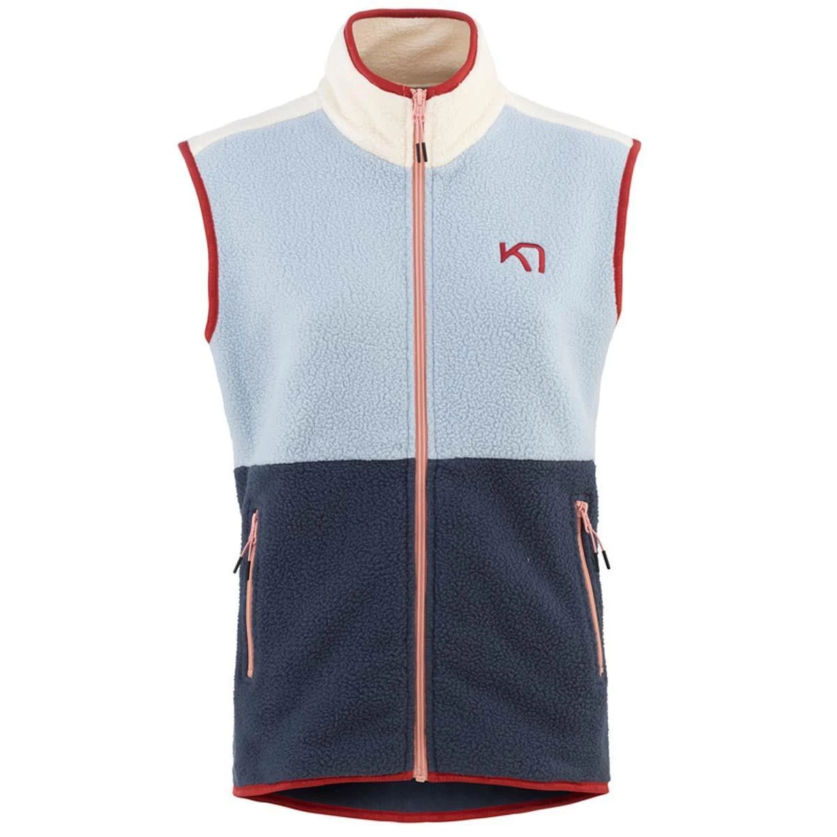 The Kari Traa Midlayer Vest is a super-cozy sleeveless womenโs fleece made from cuddly pile material. It has a high button-up collar and an elastic hem and cuffs to keep out the cold. It also rocks a relaxed cut, a retro two-tone look and third color flashes. Details like the trim, drawstrings and embroidered logo add fun to this patchwork style. And you can hit the outdoors with a clear conscience: the materials used are recycled. OEKO-TEXยฎ 100 certification means that the main fabric poses no harm to human health.