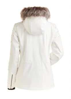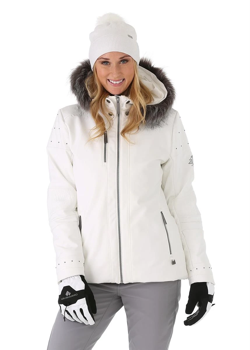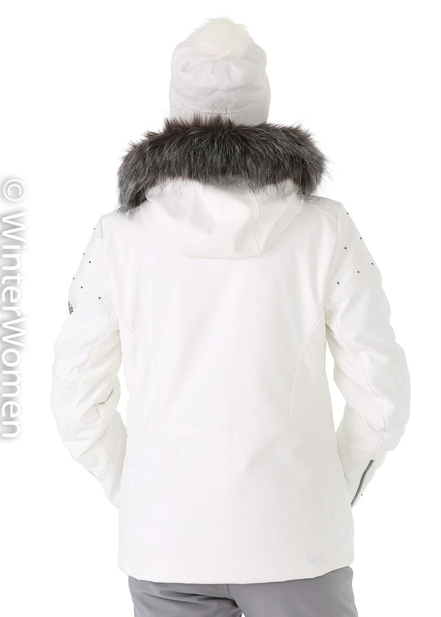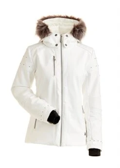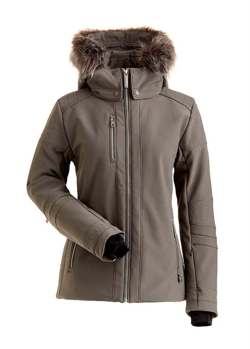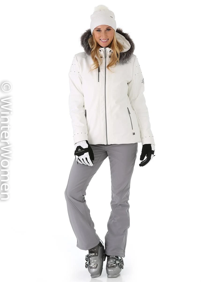 Women’s Ski Jacket Solid color hip length jacket in a 3 layer, 4 way stretch fabric with custom pewter hardware and studs. Faux fur.