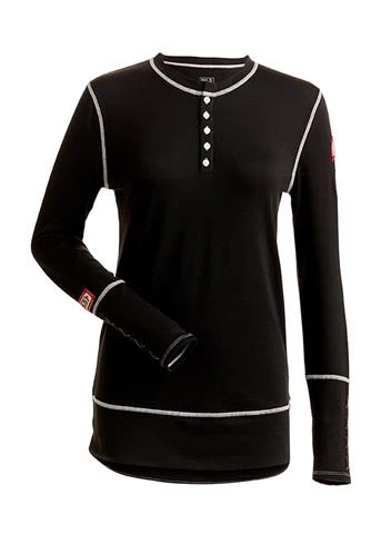 The Sharon baselayer top is a lightweight crew neck with natural wicking properties, contrast coverstitch, NILS anniversary patch, thumb thongs, and button details on the front.