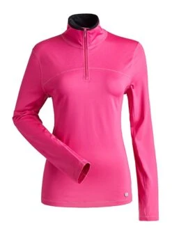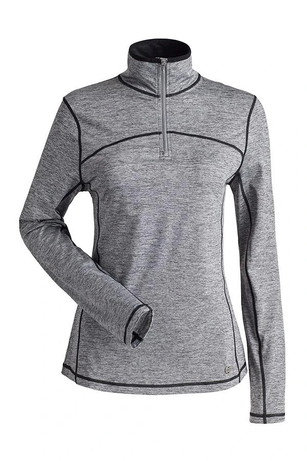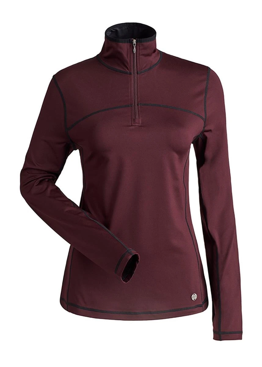 The Sienna baselayer top is a midweight 1/4 zip t-neck with coverstitch detail, thumb thongs, and natural wicking properties.