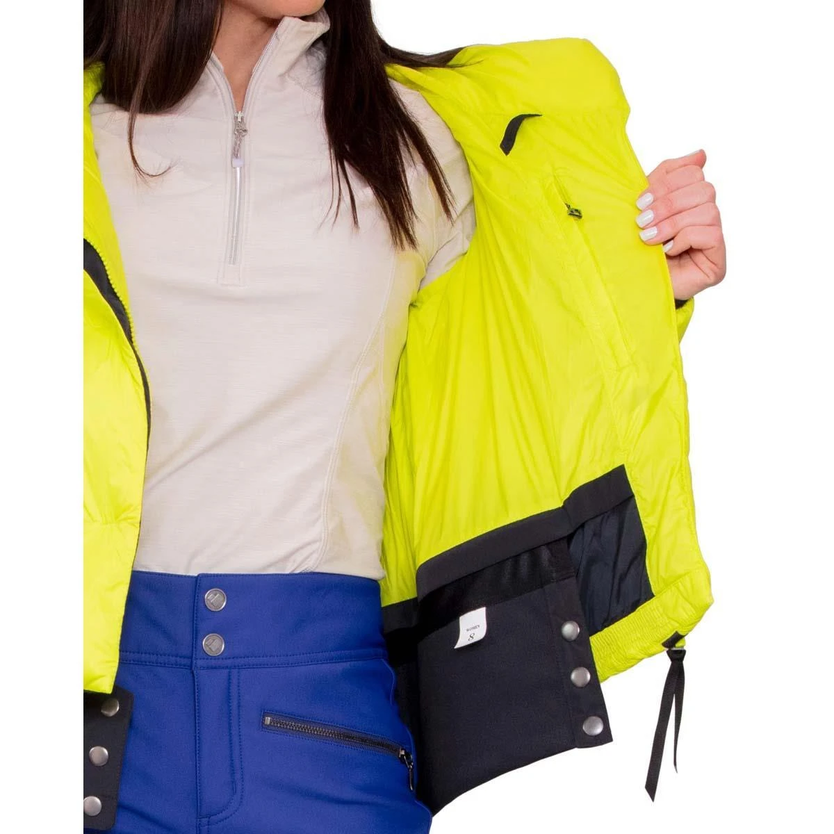 Super soft fabrics, the warmth of down, and a fun customizable style defines the Calypso Down Jacket; it is like wearing your favorite down comforter. Featuring a removable, water resistant rib-knit hem that functions as a powder skirt but also gives another 3” of length. For trips around town remove the skirt and you have a very flattering jacket in a shorter length. Warmth and comfort are the Calypso’s priority with Allied Feather and Down’s responsibly sourced 700 Fill Power Duck Down insulation. Interior electronics pocket will keep your valuables secure, and choose from one of our special fabrics or prints that matches your style.