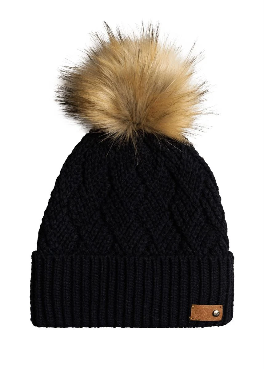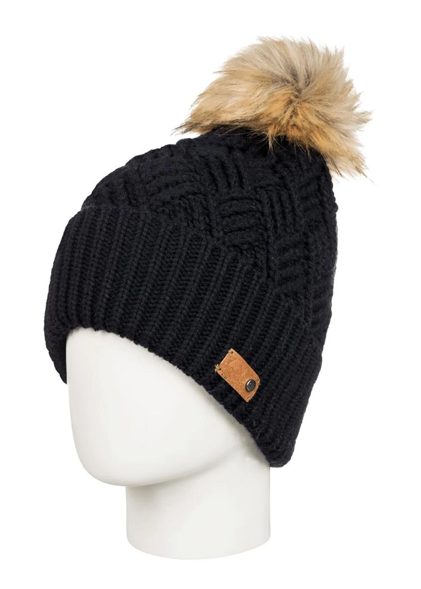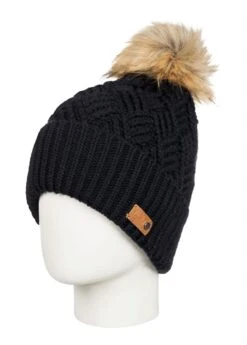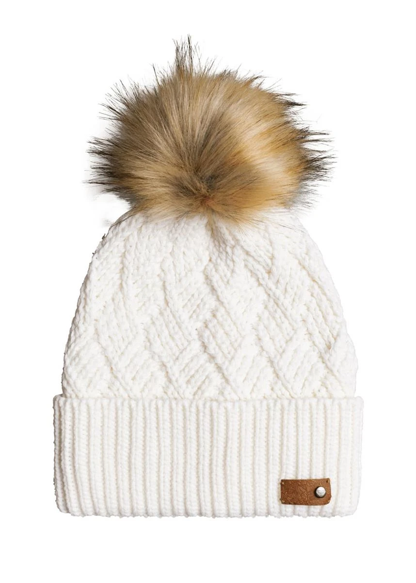The Women’s Ski Chic Beanie from Roxy has a warm comfortable fit. This beanie features a cross cable knit, folded fit, and natural faux fur pom.