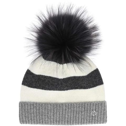 - Ultra-soft lambswool color block striped beanie with fur pom
