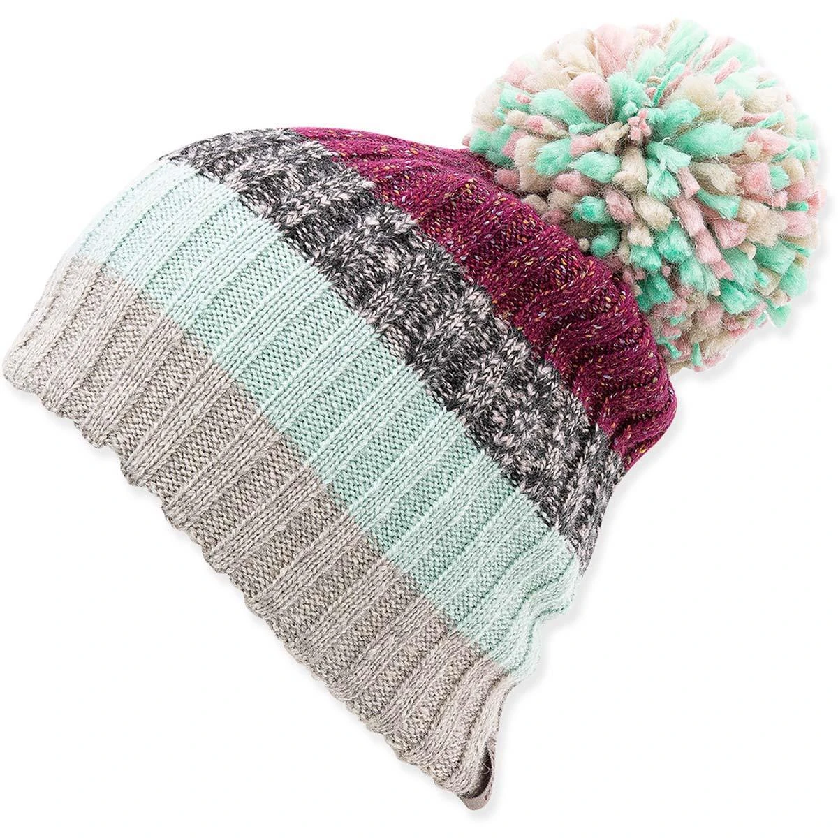 Wide rib-knit with fun bold stripe pattern, large multicolored pom